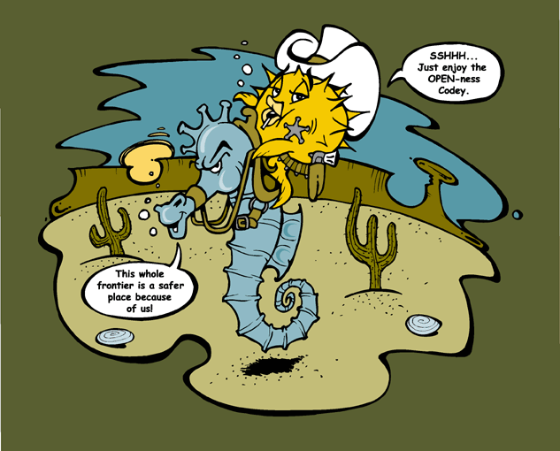 The new OpenSSH T-shirt features the SSHeriff in a new adventure.