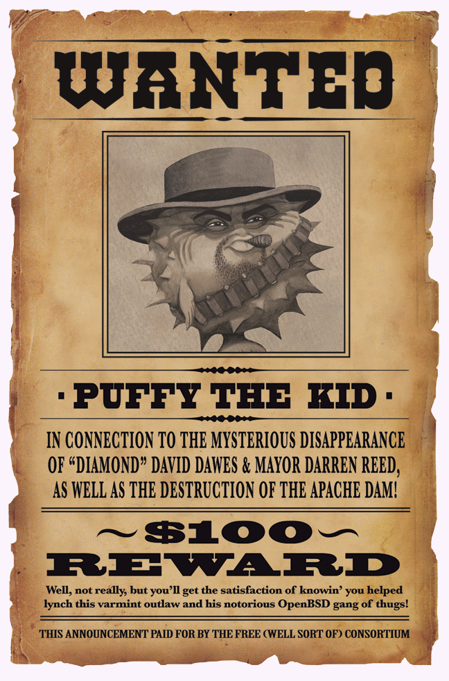 Wanted poster for the OpenBSD gang — it is utterly ridiculous for people to insist that some things should be free. On a brown T-shirt.