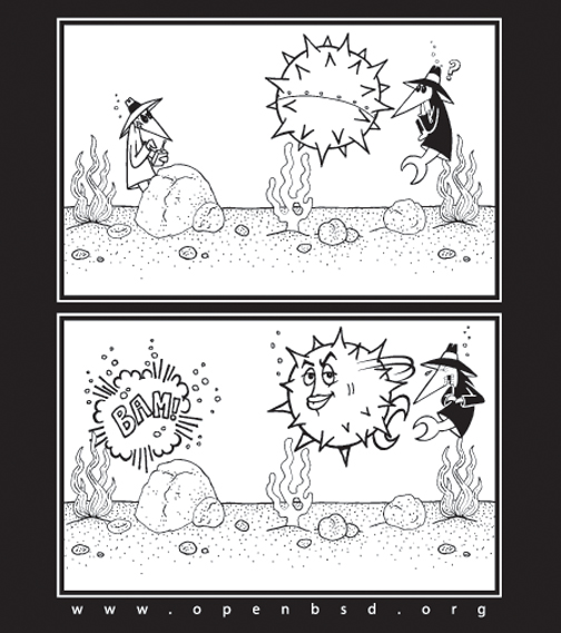 Front of T-shirt contains a picture of the Blowfish, and a vague reference to how using the blowfish cipher for the OpenBSD password hash makes our password mechanism more secure (blowfish, not babblefish). People won't be able to crack your passwords anymore... Back of T-shirt contains the complete source code for our version of the Blowfish algorithm (written in Germany). For more information see our cryptography page...