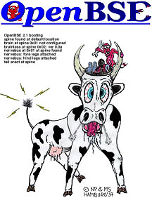 Front of T-shirt contains the original OpenBSD "Open the Daemon" picture. The back picture resulted after one of our developers told his mother that he was working on OpenBSD — she misunderstood and thought he meant BSE — Bovine Spongiform Encephalopathy (i.e. Mad Cows Disease).